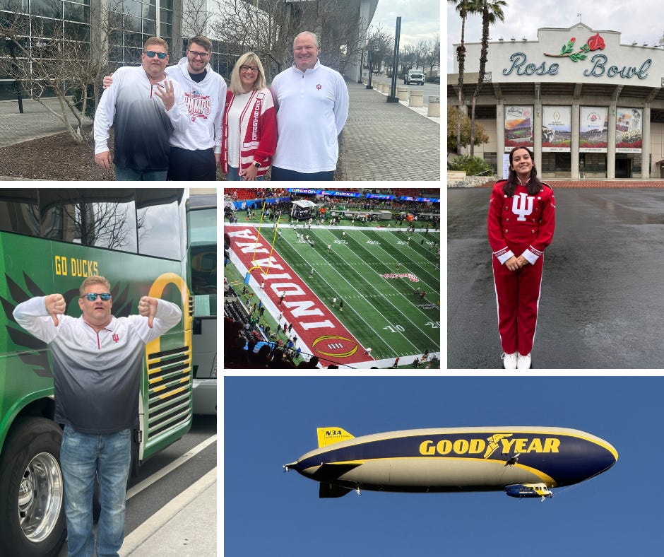 Local fans continue to celebrate as the Indiana University football team worked its way to the national championship game, to be held Monday, Jan. 19, in Miami. Top left, Joe Dickmann and his son Luke Dickmann and Mandy and Mike Bunton enjoy time in Atlanta last week. Top right: Shelbyville High School alumna Jessica Howard, a member of IU’s Marching Hundred, poses for a photo early this month outside the Rose Bowl in Pasadena. Center: MaryAnn Wethington and Terry James show their view at the Peach Bowl. This isn’t James’ first time celebrating IU’s late season success. He was at the Rose Bowl in 1968. Lower left: Joe Dickmann shows his allegiance while walking past the hotel hosting the Oregon Ducks last week. Lower right: A Rose Bowl photo from Michelle Nolley shows the Goodyear blimp in action.