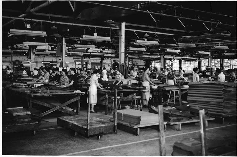 The interior of the Kennedy Car Liner factory and women working are shown in this undated, black-and-white glossy photo found in the Grover Museum collection. Want to learn more about this piece or others in the collection? Contact the Grover Center at archive@grovercenter.org.