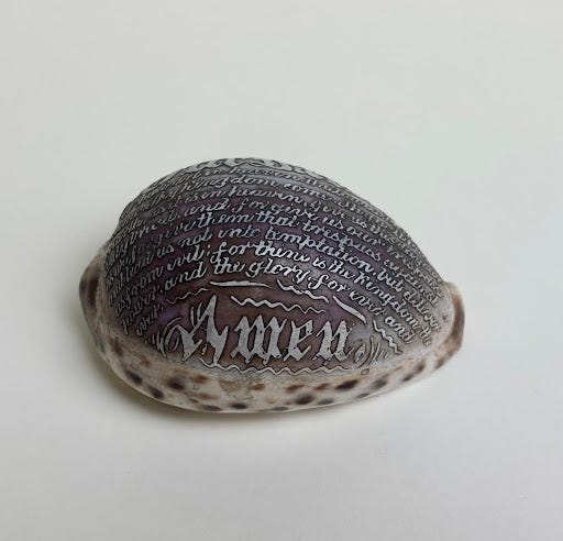 This cowry shell, from Lena Firn Grover’s collection, has the top polished smooth and engraved with raised letters to read the “Lord’s Prayer” in a script font. Acquired by the Grover Center in 1981. Want to learn more about this piece or others in our collection? Contact us at archive@grovercenter.org.