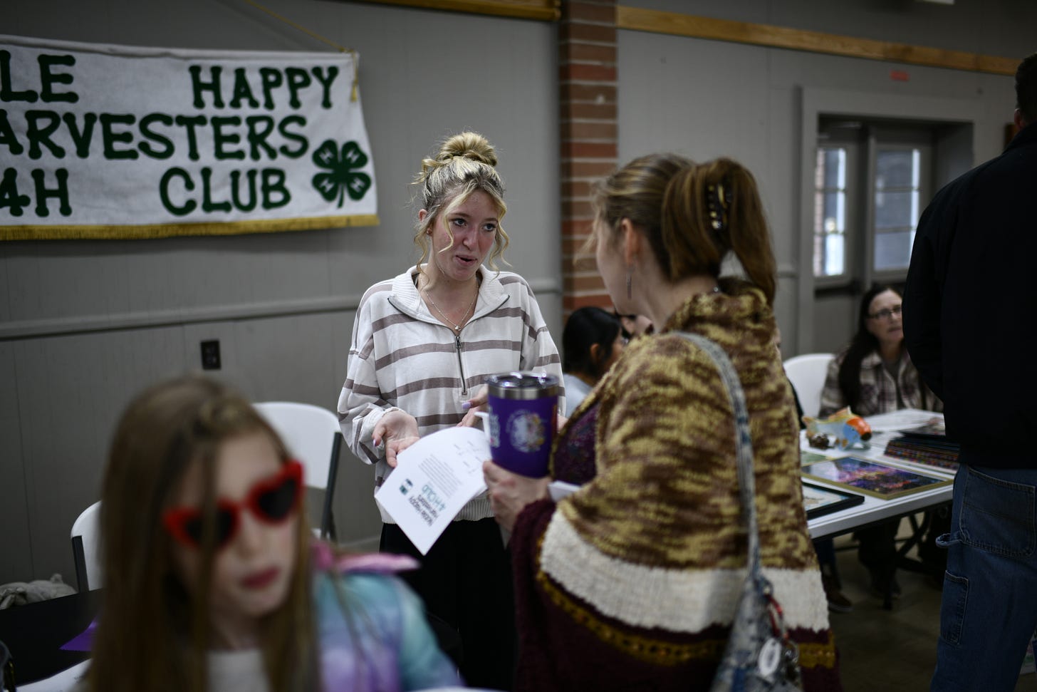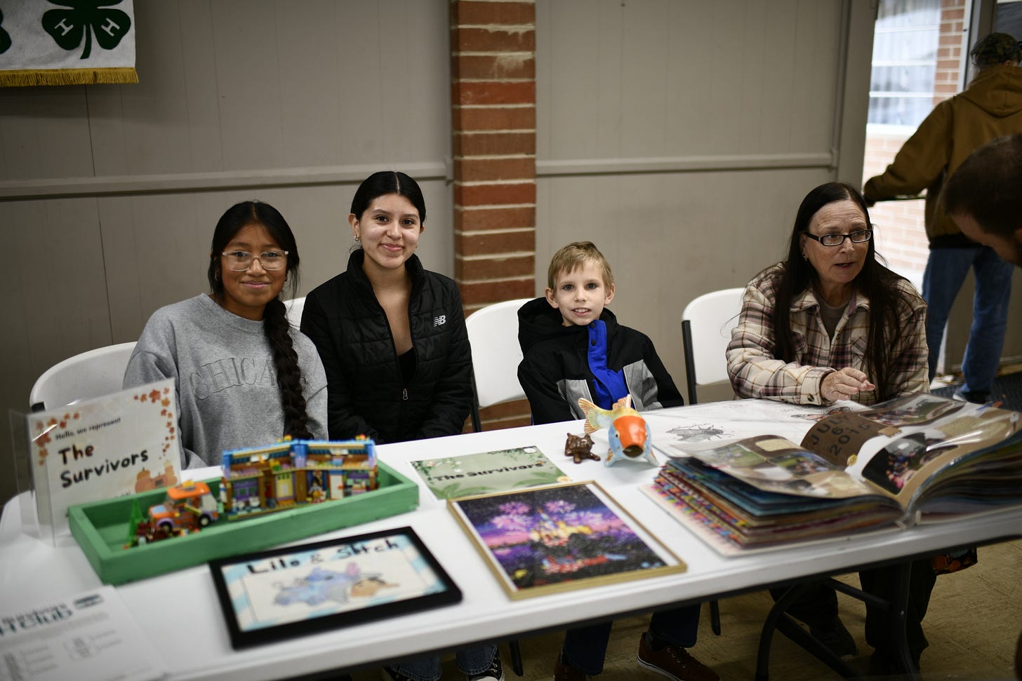 From left, The Survivors 4-H club members Ari Campechano and Areli Cadena-Moreno, Kaden, and club leader Deana Thurston oversee their table yesterday at the 4-H Club Open house, hosted in the Family Arts Building at the Shelby County Fairgrounds. Below, Maddie Huntsman explains the value of 4-H participation to attendees. | photos by KRISTIAAN RAWLINGS