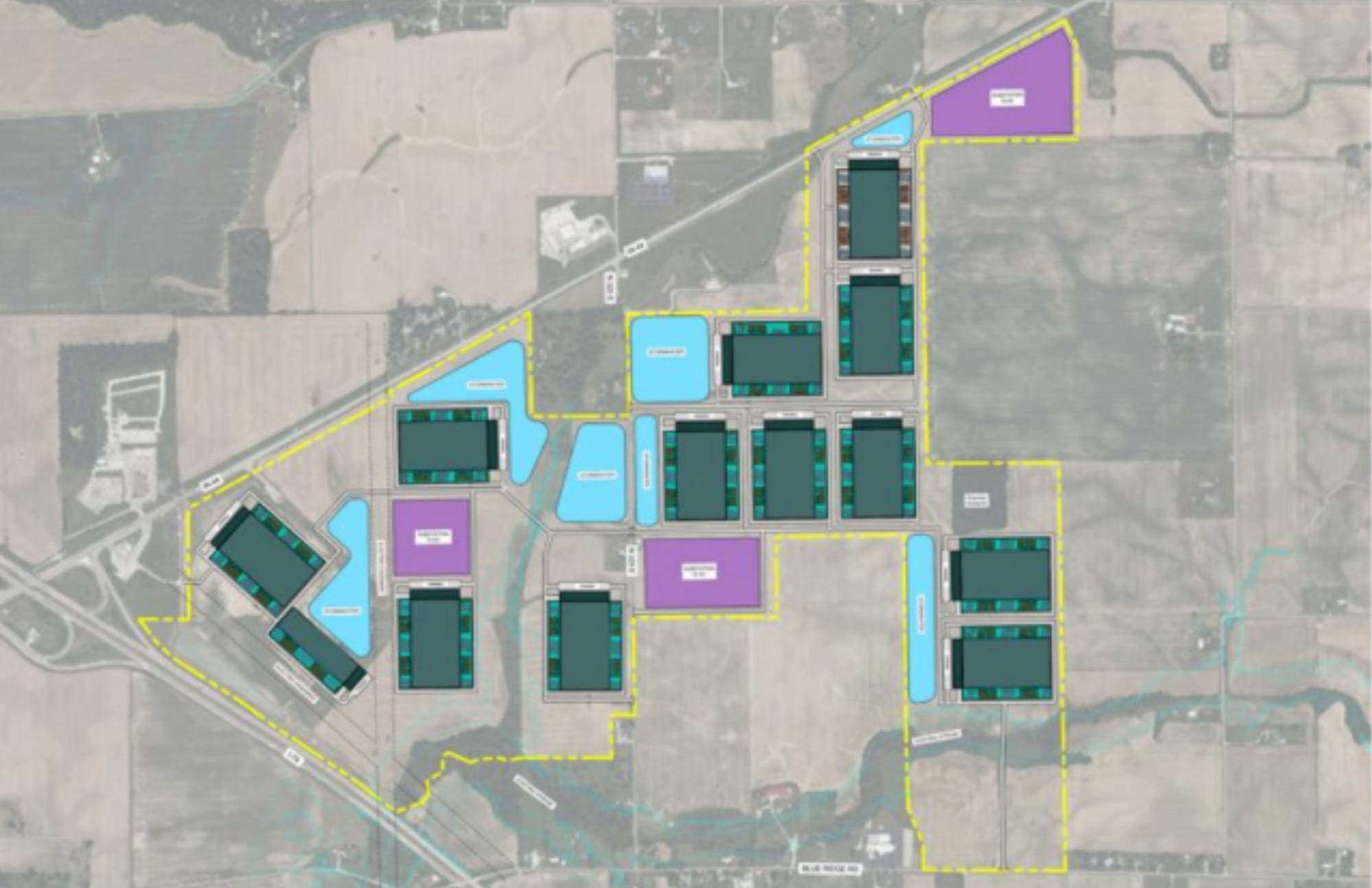 A preliminary design shows the layout of a data center campus proposed near the Interstate 74-State Road 44 interchange in Shelbyville.