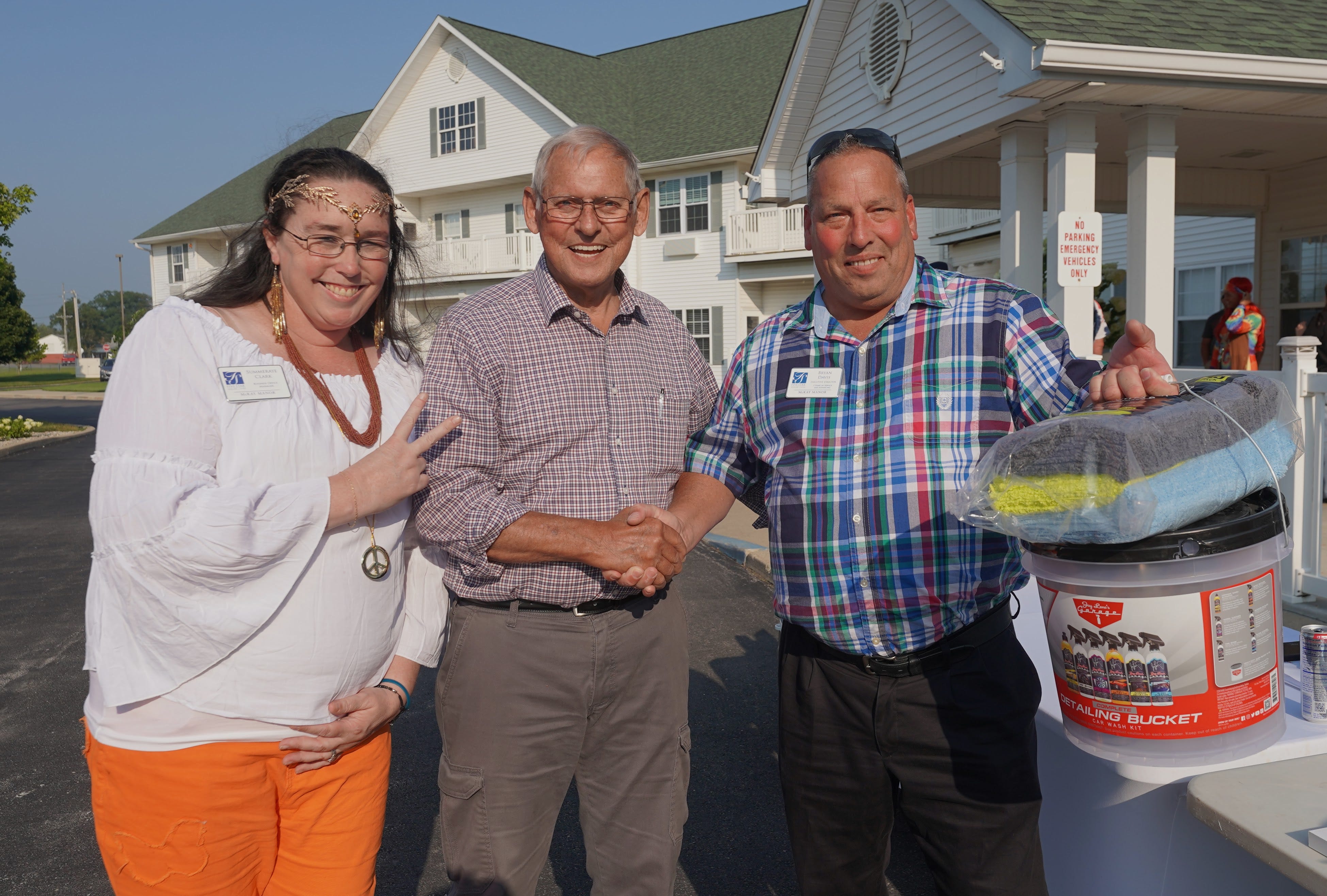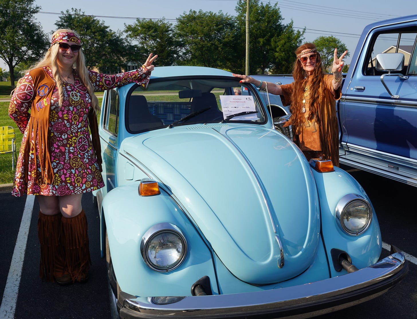 The daughter-mother team of Chelsea Stewart (left) and Carolyn Shadle (right) show off their choice for an award at the McKay Manor Car Show on Friday. The Volkswagen “Bug” is owned by Jim Thomas of Indianapolis, who said he bought the car new and that it now had over 100,000 miles. More than 30 classic cars lined the McKay Manor parking lot on Friday for the event. Below, Gary Purvis, Union Township, accepts an award from Summeraye Clark and Bryan Davis, business office manager and executive director, respectively, at the facility. | photos by JACK BOYCE