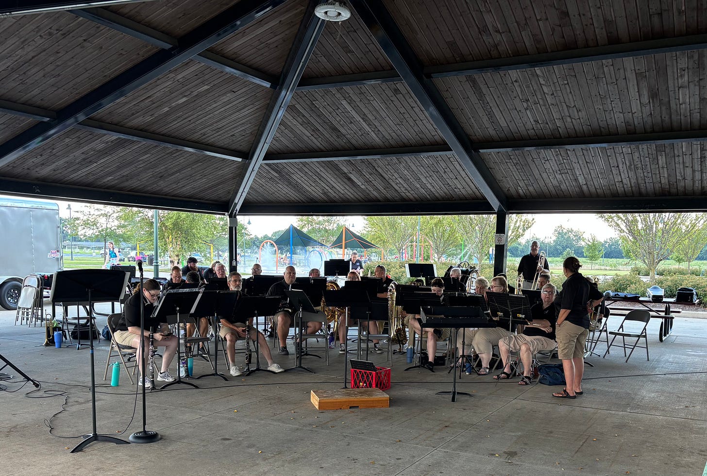 Shelby Community Band members prepare to play a patriotic-themed concert last night at Blue River Memorial Park. | photo by KRISTIAAN RAWLINGS