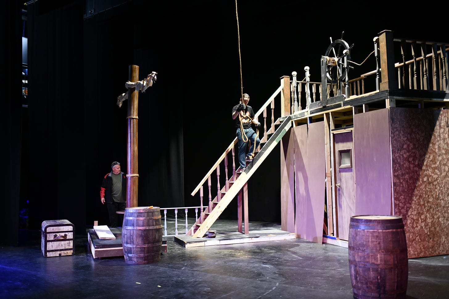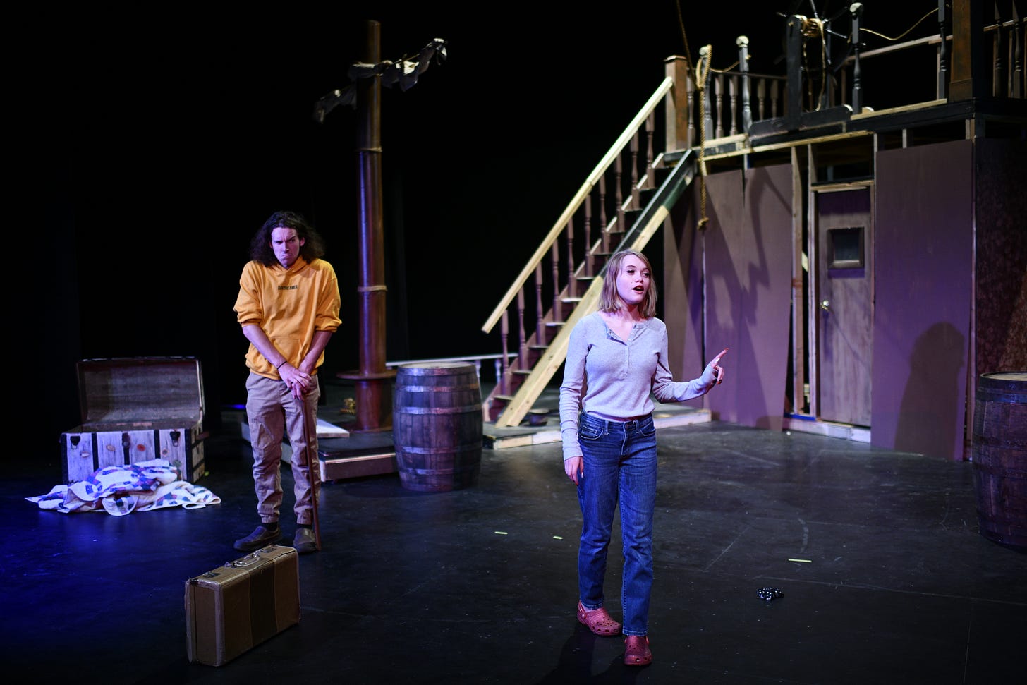 Wyatt Schonfeld, as Roderick, practices a rope swing from the set early last week. Below, Peyton Rader (Peg) and Raya Sizemore (Amelia) rehearse a scene. | photos by KRISTIAAN RAWLINGS