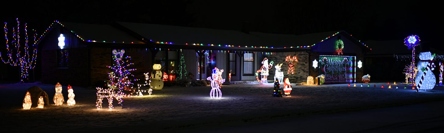 A Christmas light display on Swinford Street illuminates last night’s light snow. | photo by KRISTIAAN RAWLINGS
