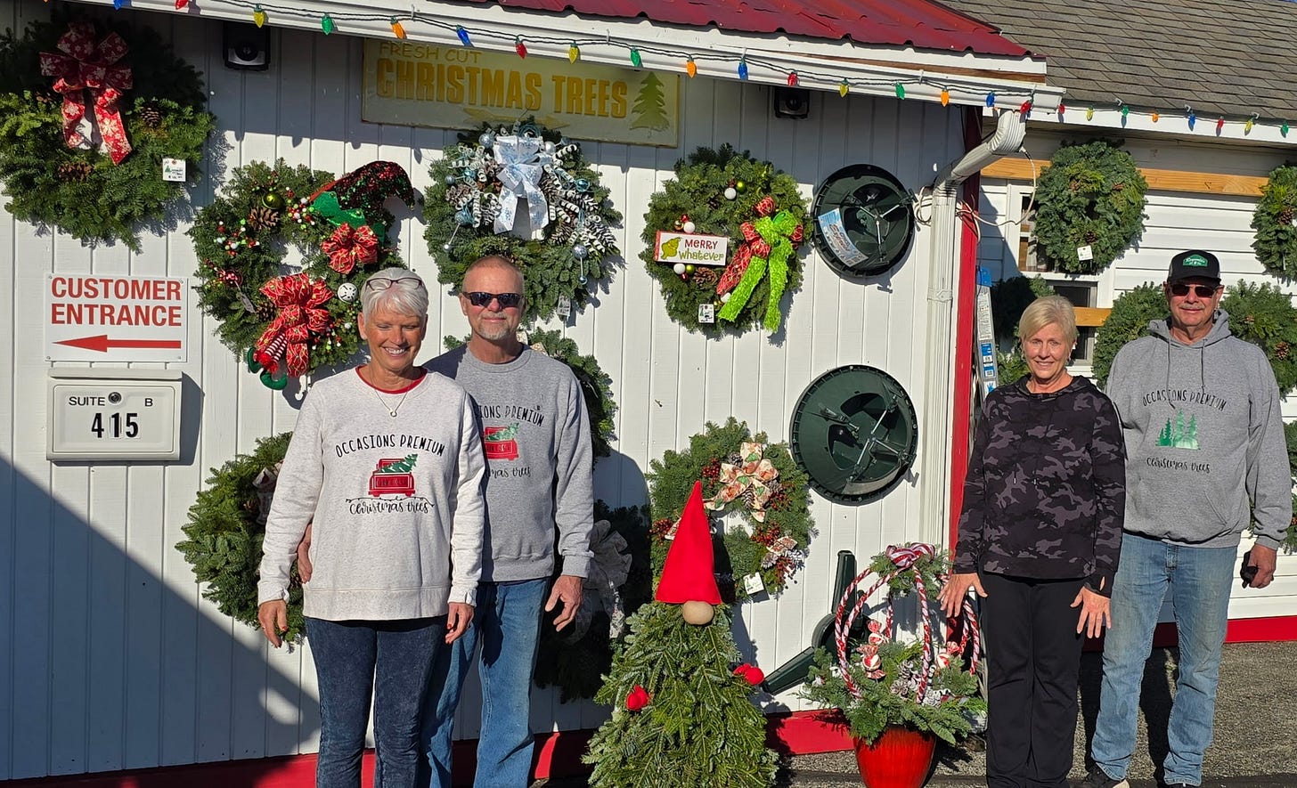 Many families purchase live Christmas trees during Thanksgiving weekend, and Occasions Premium Christmas Trees on East Hendricks Street has been busy preparing for the season. Last weekend, Rick and Lisa Robinson joined Tami and Martin Zinzer in unloading freshly cut trees from northern Michigan for the lot’s opening. The stand, now in its sixth year at the location, offers Fraser fir, Scotch pine, white pine and Douglas fir varieties from three to 10 feet, as well as handmade wreaths, porch pots, gnomes, grave blankets and holiday garland. The lot is open daily, 10 a.m. to 8 p.m. Monday through Saturday and 10 a.m. to 6 p.m. on Sundays until the inventory is sold out. Below, the Robinsons (left) and Zinsers pause briefly during unloading. | photos by ANNA TUNGATE