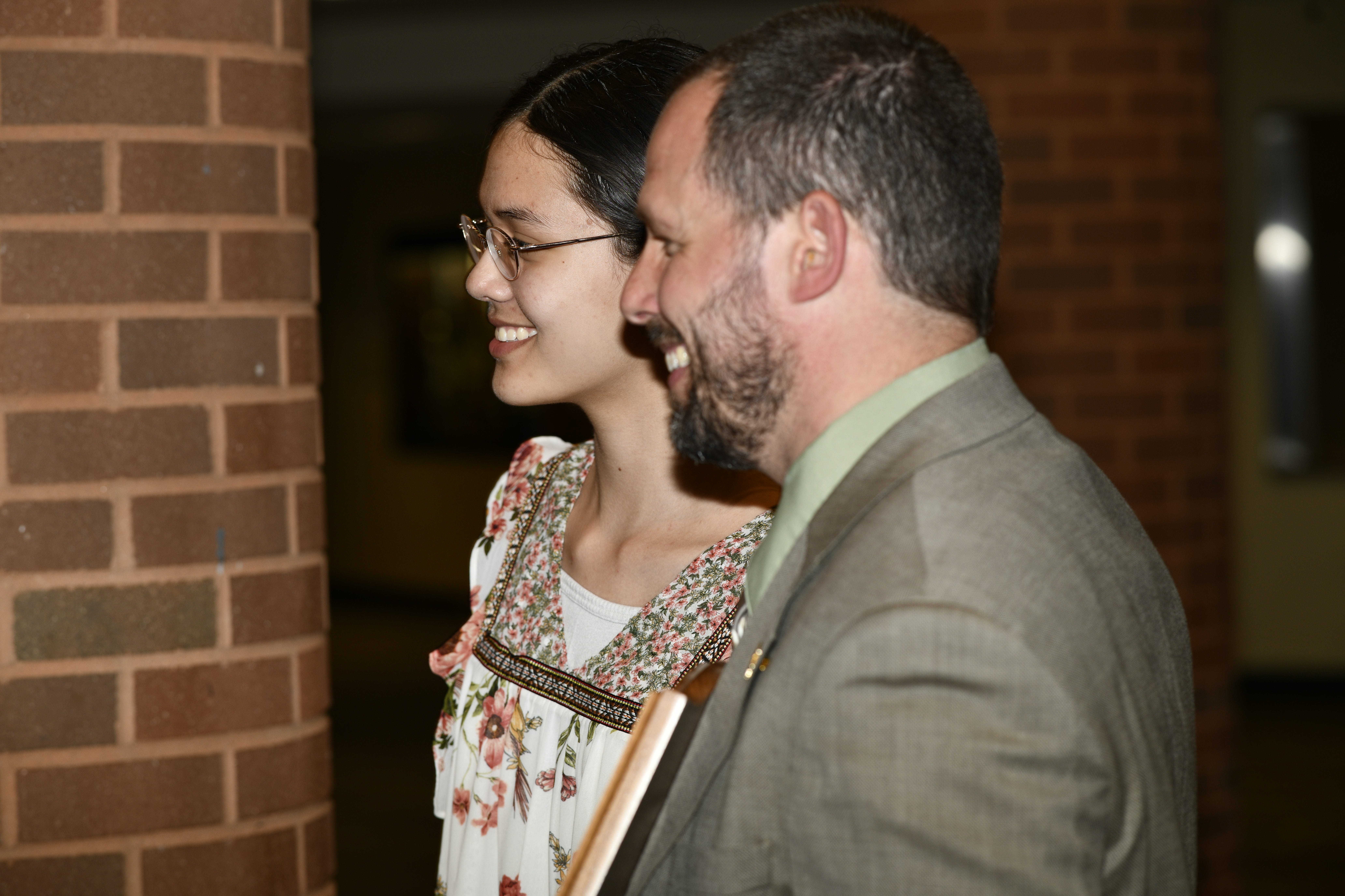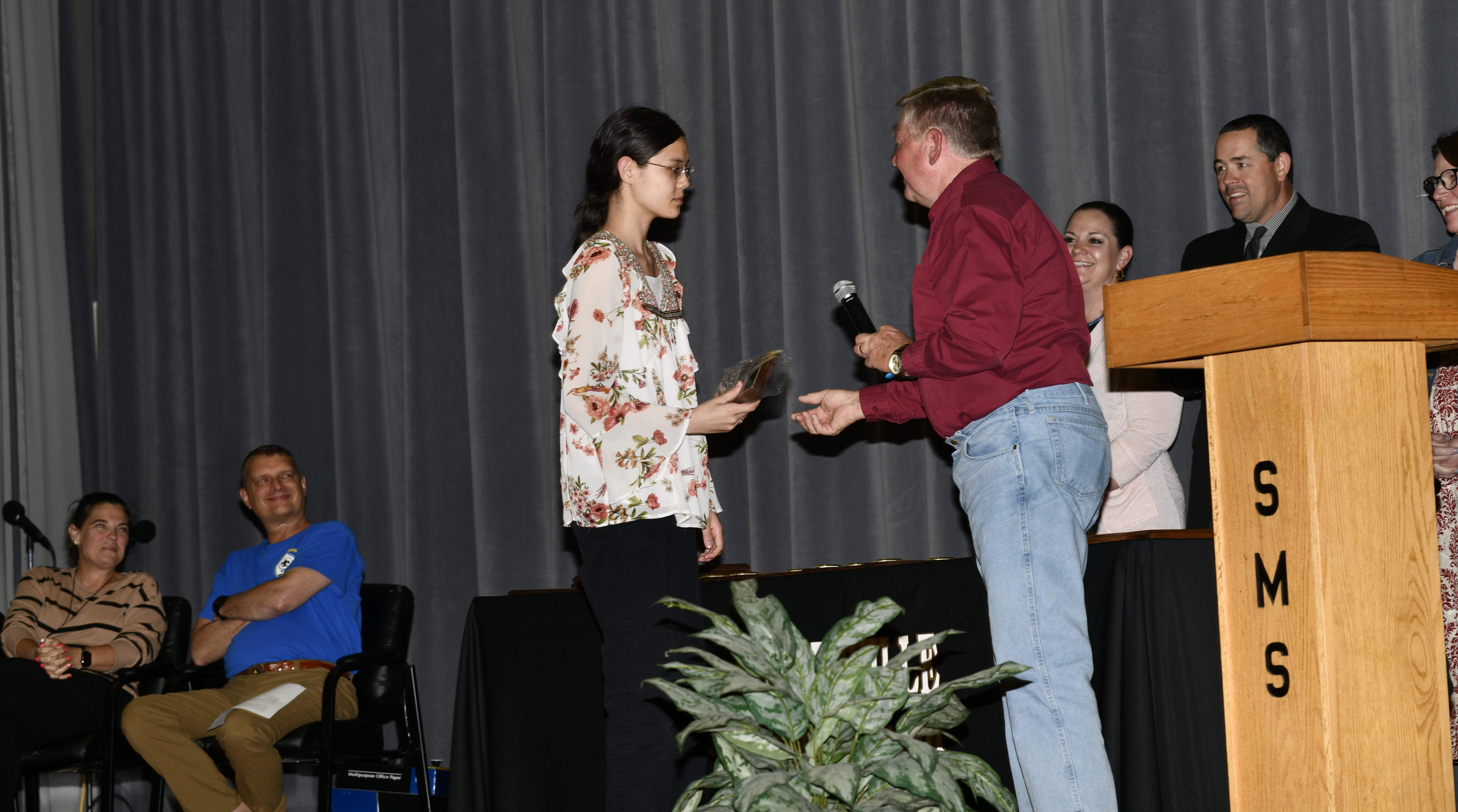 Shelbyville Middle School eighth-grade student Elizabeth Washburn accepts the Roland Stine Award, presented by Rick Hauke of the Shelbyville Kiwanis Club, at last night’s academic awards ceremony, while faculty and staff members Jennifer Dixon, Scott Hughes, Katie Beyer, Rex Olds and Nicci Sargent look on. Roland Stine, who died in 2003, was a Shelbyville High School graduate who taught at the old junior high and SMS. He also served as a city councilman and a State Representative. BELOW: Washburn and SMS Principal Wes Hall hold up the Stine plaque for Elizabeth’s family to take photos after the ceremony. | photos by KRISTIAAN RAWLINGS