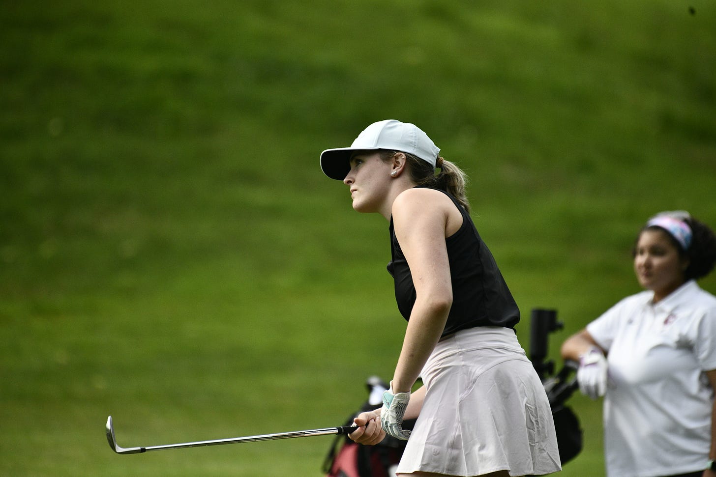 Shelbyville High School senior golfer Riley Everette plays yesterday in the Pendleton Preview, where she scored an eagle on a hole. The meet marked the first sports event of the season. | photo by KRISTIAAN RAWLINGS