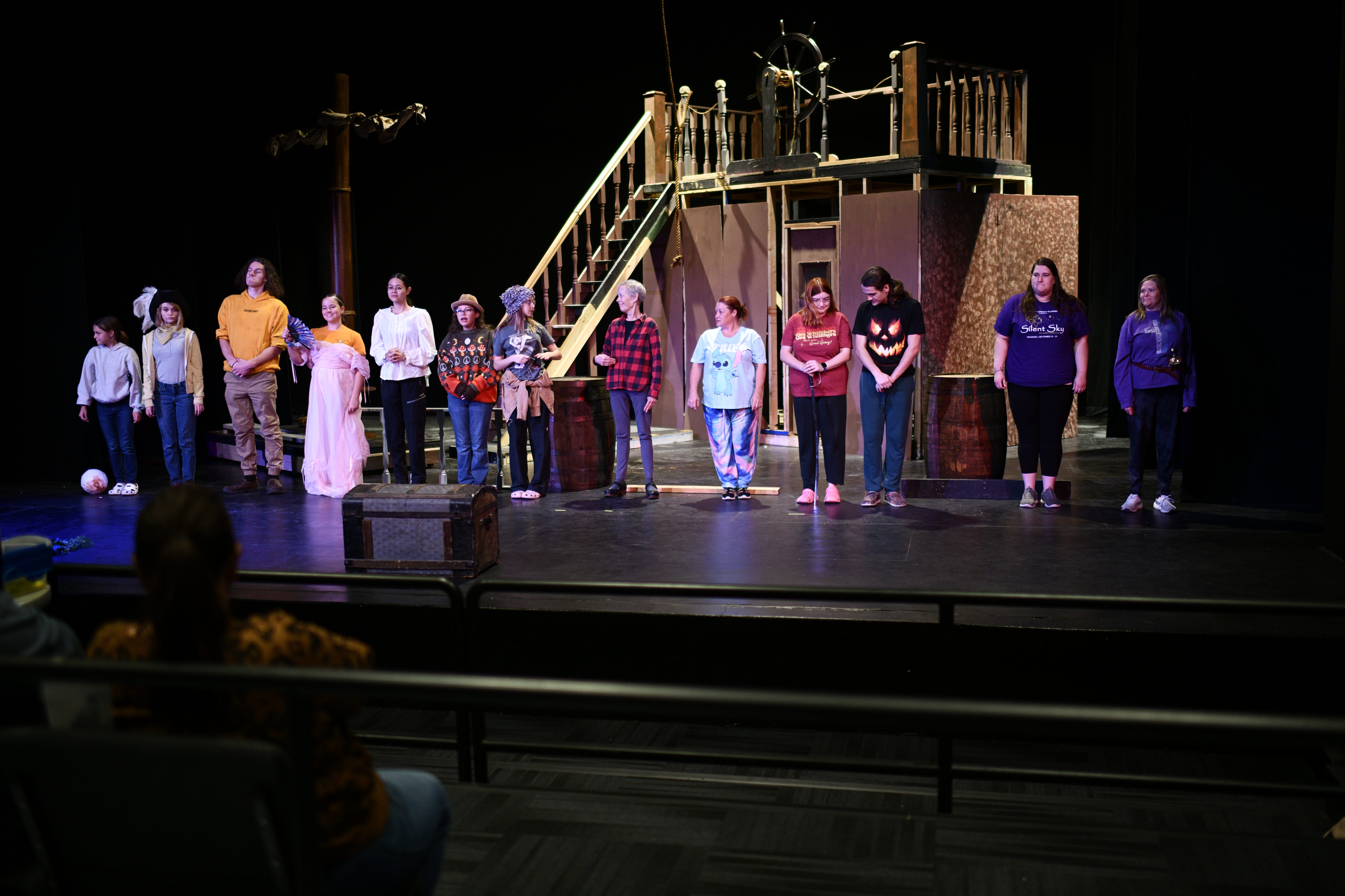 Cast members last night wrap up a rehearsal of “Pirates of the Amazon: The Treasure of Mystery Island,” opening Nov. 7 at the Wortman Family Civic Theatre on Miller Avenue. From left, Anessa Ramsey, Raya Sizemore, Peyton Rader, Zoe Graves, Elizabeth Washburn, Raelynn Ramsey, Katie McFarland, Nancy Worland, Letitia Clemons, Yvette Clemons, Wyatt Schonfeld, Abigail Andrews and Janell Coffey. The family-friendly adventure runs through Nov. 16, with special student matinees for county second- and third-graders on Nov. 12 and 13. Purchase tickets here. | photo by KRISTIAAN RAWLINGS