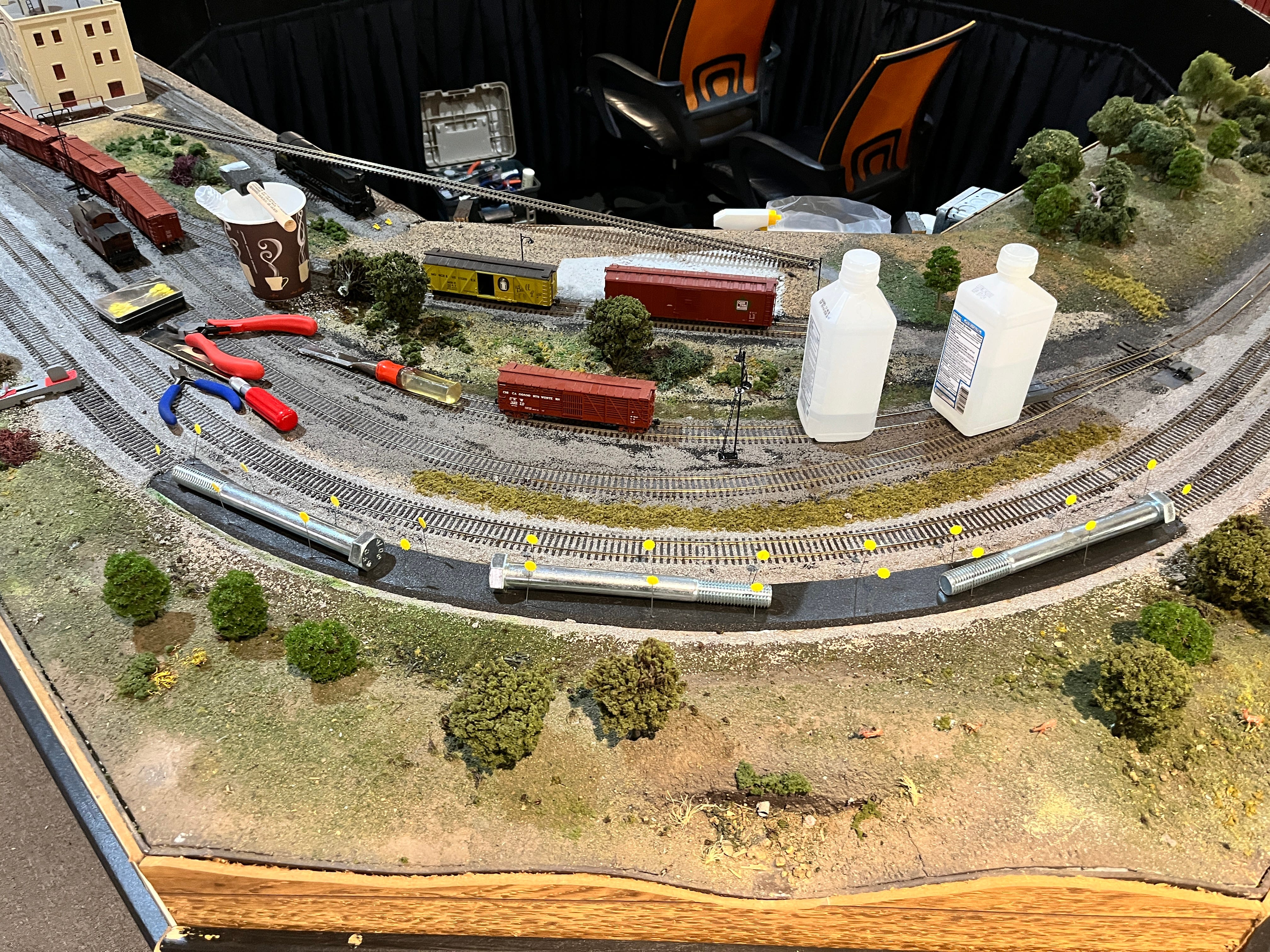 New roadbed is glued in place and secured with pins and weights as repairs continue on the Grover Museum’s model train display. | photo by JOHN WALKER