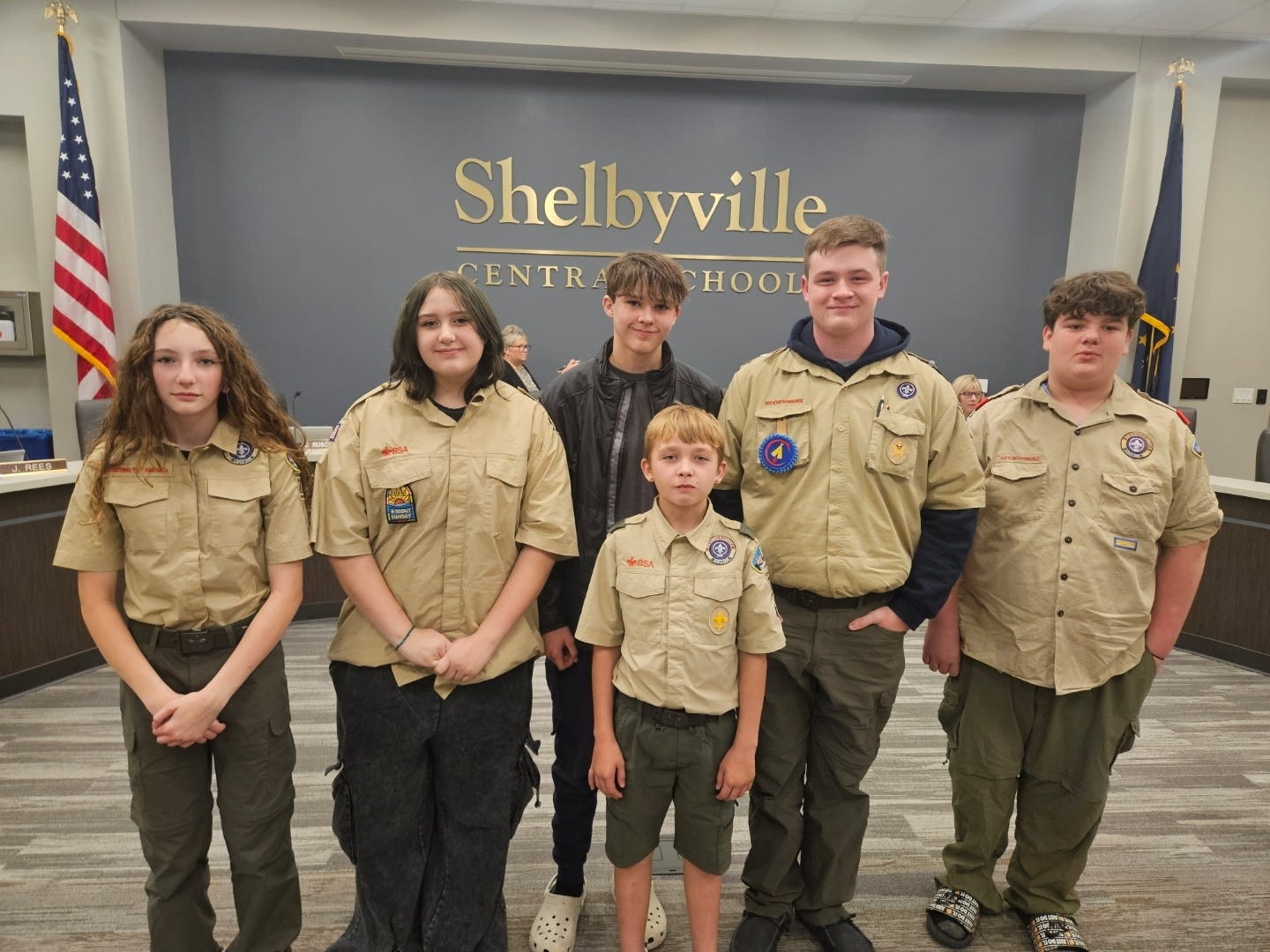 Scout Troops 223 (boys) and 2230 (girls) attend Monday’s Shelbyville Central Schools board meeting as part of their work toward the Citizenship in the Community merit badge. From left, Lauren Kent, Skylar Hanover, Miles Hanover (black jacket in back), Jace Potter (front), Julian Anspaugh and Landyn Shirrell. The troop leader is Gary Fuller, and Scott Hughes is the committee chair. | submitted