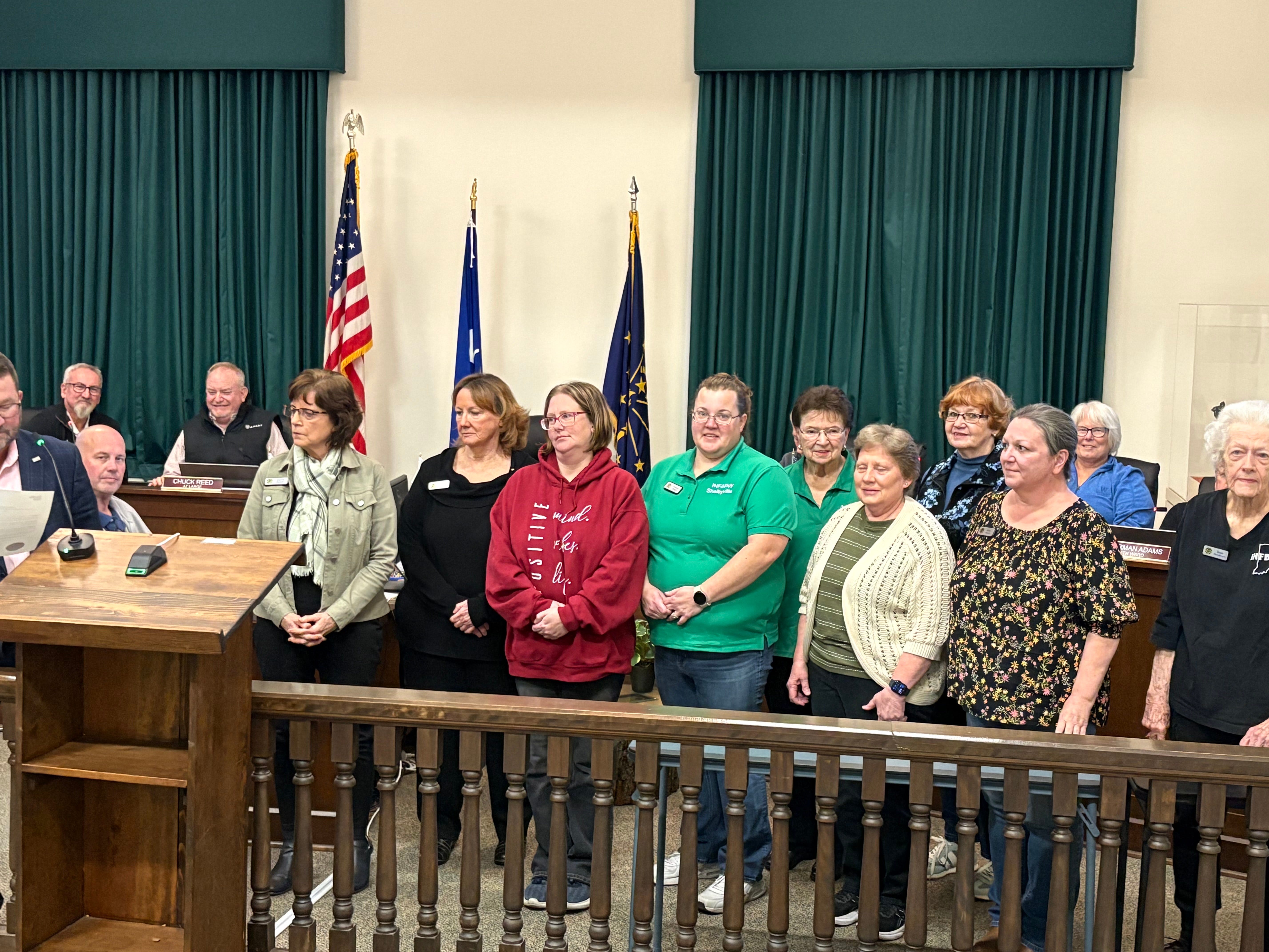 Members of the Shelbyville chapter of the Indiana Federation of Business and Professional Women accept a proclamation from Mayor Scott Furgeson on Monday recognizing Working Women’s Month. From left: Acting President Joanne Bowen, Theresa Adams (past state president), Brandy Moore, Kimberly Sturgill, Charlotte Towne, Sherry Mohr, Dorcas Dorsett, Emily Fannin and Gayle Henderson. The local BPW chapter, which celebrates its 98th year in 2025, focuses on scholarships for high school seniors and women entering college and is known for its Reality Store, RADA knife sales and annual spaghetti dinner. Those interested in speaking at a meeting or joining may contact Bowen at jrtrophies@hotmail.com. | submitted